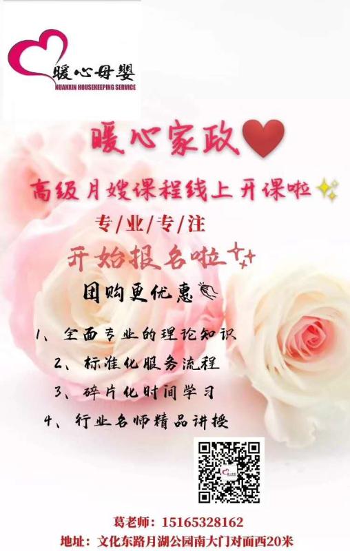 暖心家政于2013年經(jīng)青島市工商局批準成立,具備獨立法人資格。是一家集母嬰護理,育嬰早教,老年護理為一體的綜合性服務(wù)機構(gòu),常年開設(shè)高級月嫂 育嬰師,面點師、茶藝師,催乳師,養(yǎng)老護理等方面的課程培訓(xùn),培養(yǎng)社會需要的各方面專業(yè)人才。